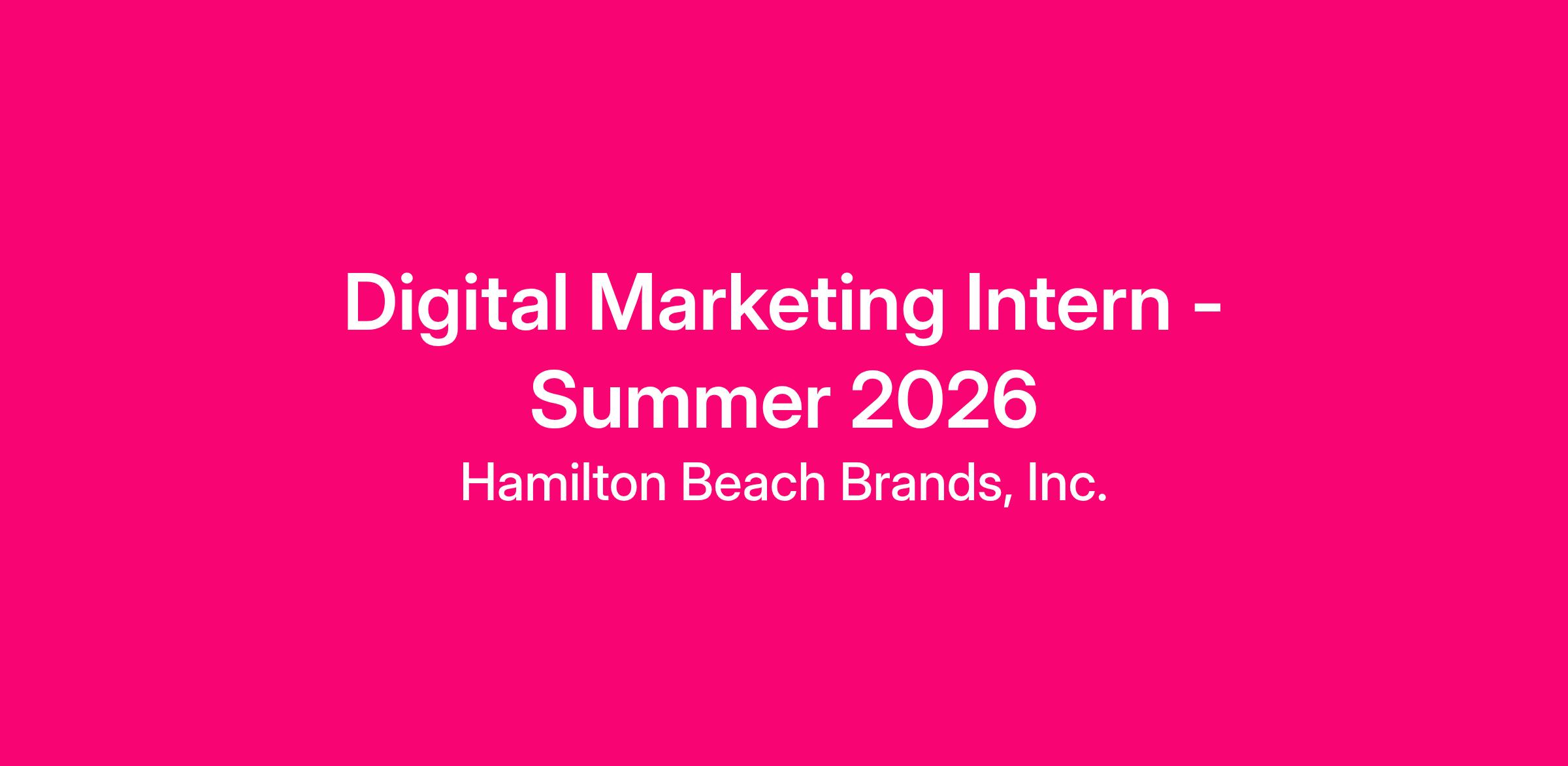 Hamilton Beach Brands, Inc. is a leading designer, marketer and distributor of a wide range of branded small electric household and specialty houseware appliances. Hamilton Beach, Proctor Silex and Weston Brands products can be found in households and businesses throughout the world. We are seeking a creative and talented Digital Marketing Intern to join our Consumer Digital Marketing Team during the 2026 Summer semester.