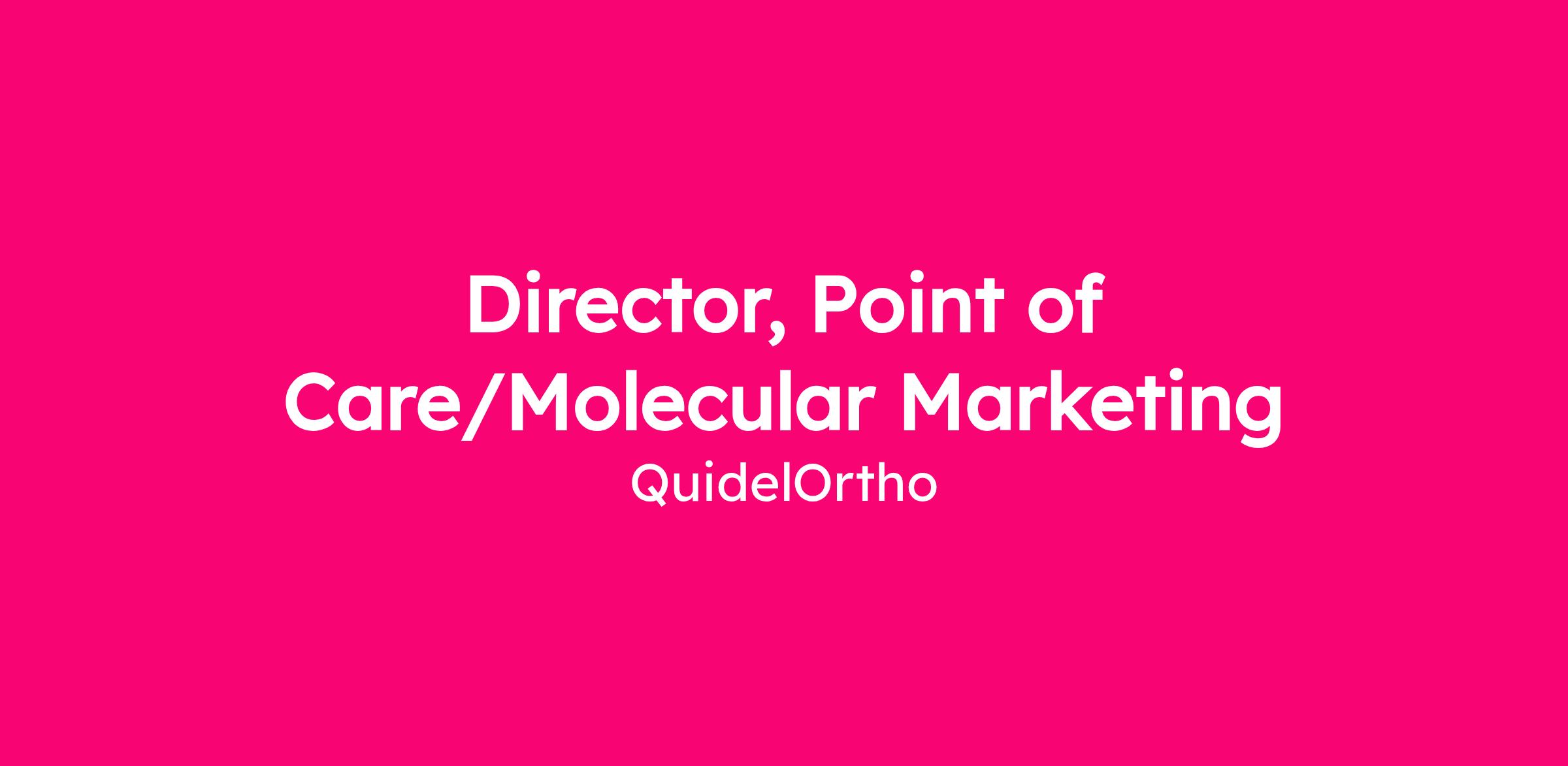 At QuidelOrtho, we’re advancing the power of diagnostics for a healthier future for all. Join our mission as our next Director, Point of Care/Molecular. The Director, POC/MDx Marketing is responsible for the commercialization of Point of Care (POC) and Molecular (MDx) products in North America which includes Canada to assure leadership in the marketplace. This position will be responsible for managing product forecasts, annual planning and execution of promotions, communications, and new product development for selected groups of products as assigned.