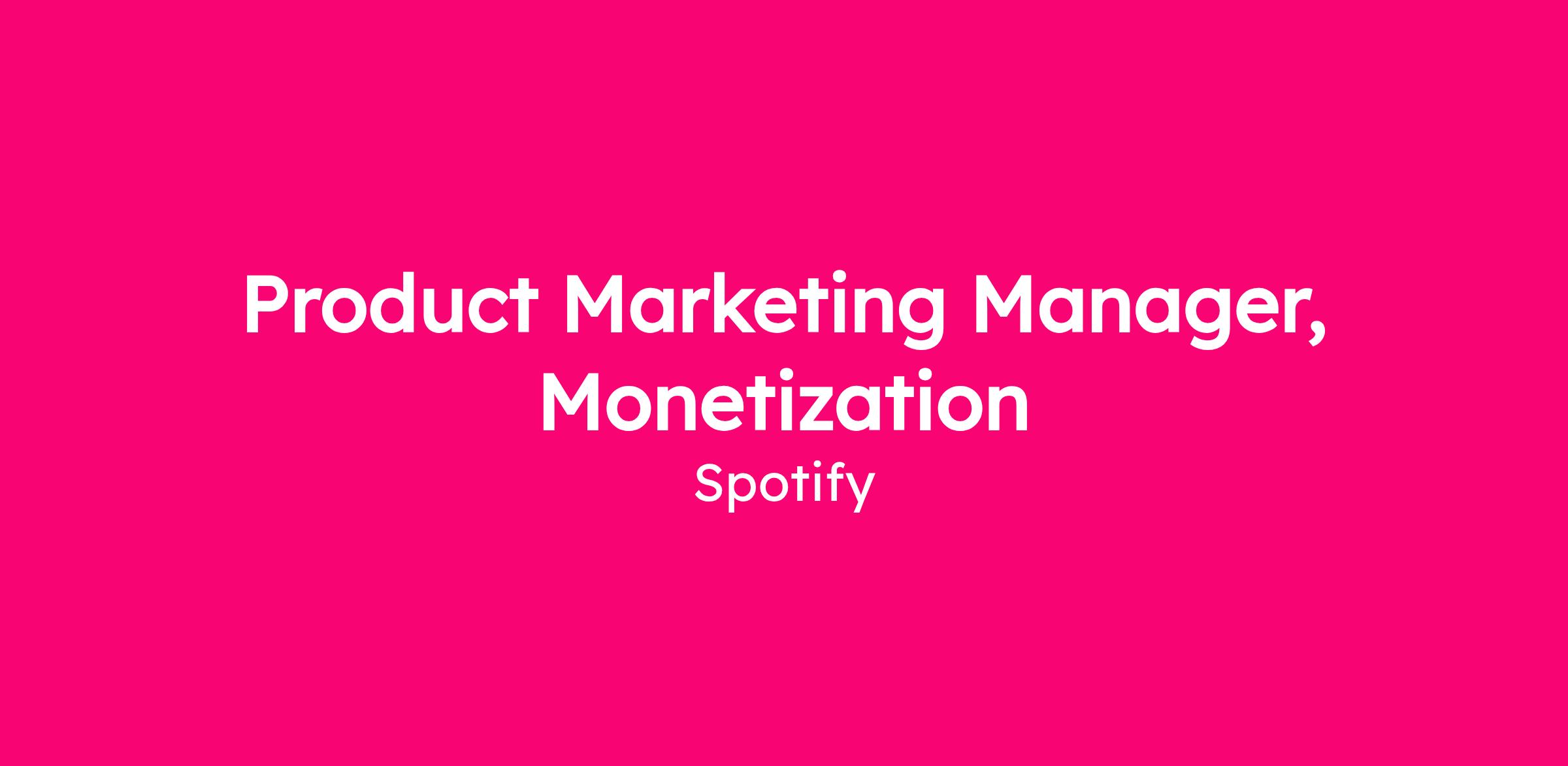 We’re seeking a Product Marketing Manager (PMM), based in the United States, to join our Monetization Product Marketing team. In this role you’ll work alongside a group of PMMs focused on advertiser experience, supporting the unification and evolution of Spotify’s ad formats. This role will serve as the voice of the customer by developing go-to-market strategies that improve product adoption and revenue growth while driving real business outcomes for our advertising partners. This is a highly cross-functional role and offers the opportunity to make a significant impact on our rapidly growing ad business, spanning the world of audio and video from music to podcasts and beyond. The Monetization Product Marketing team sits within the Global Product and Commercial growth team and partners closely with leaders across product management, engineering, design, business development, business marketing, learning & development, business operations and PR/communications teams.