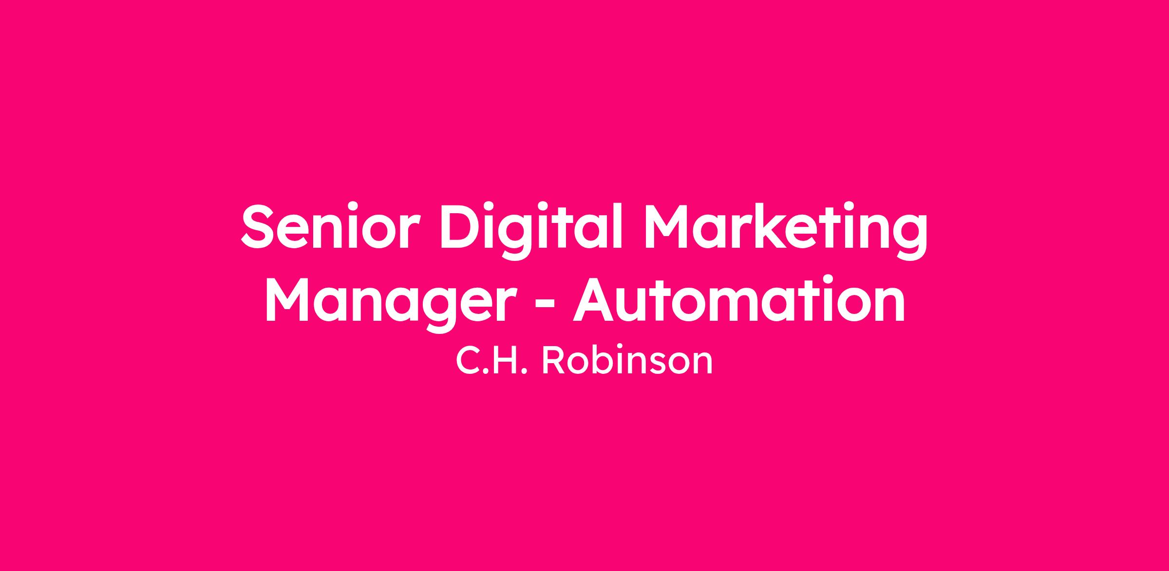 C.H. Robinson’s Global Marketing Team is looking for a Senior Marketing Automation Manager. You will be responsible for the implementation, quality assurance and analysis of our multi-channel marketing campaigns. You will partner closely with talented and diverse marketing, communications, product, analytics, technology and commercial sales teams to scope, build and update messaging initiatives, ensuring strategies are aligned, scalable and effectively support business and revenue goals. If you have experience with Microsoft Dynamics, Customer Insights - Journeys or a similar platform, experience with marketing technology, have a passion for ensuring strong customer engagement and enjoy working in a collaborative environment, this may be a great opportunity for you!