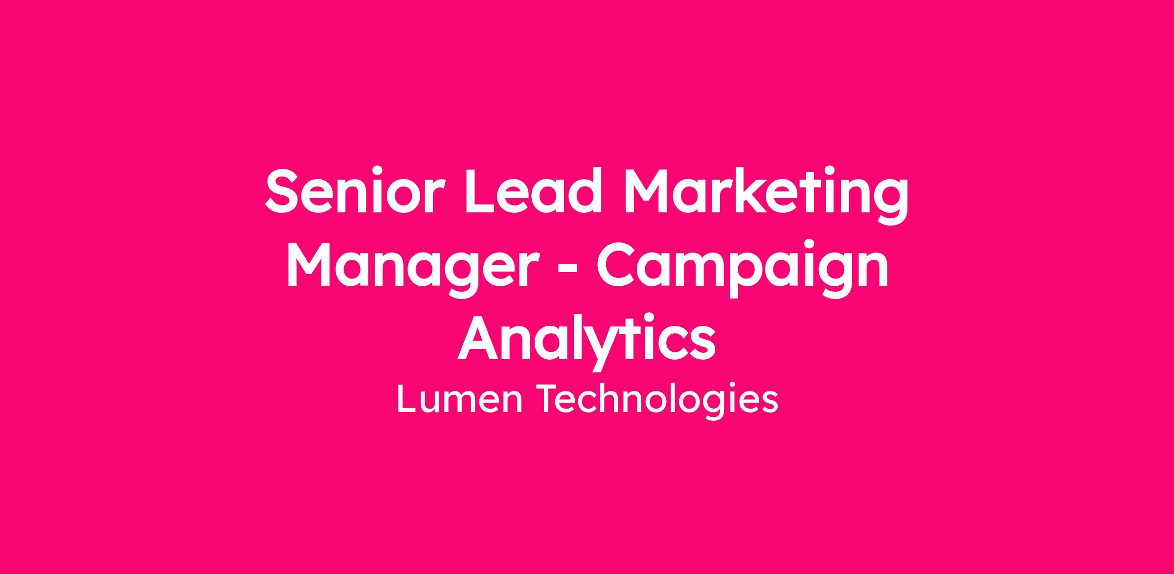 The Senior Lead Marketing Manager resides within Campaigns & Programs and reports to the Analytics Team. Campaign Analytics delivers analysis, insights, and recommendations on campaign and program performance on both a proactive and reactive basis using a range of analysis techniques to inform and optimize our marketing tactics. This is a highly visible role that requires strong project management, reporting proficiency, and strategic data analysis. The ideal candidate will be a team player focused on data analytics and marketing campaign/program optimization to substantially impact pipeline, progression, and deal closure.