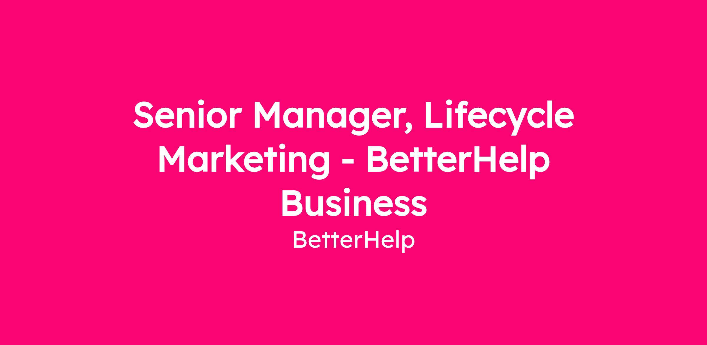 As the Senior Manager, Lifecycle Marketing – BetterHelp for Business (BHB) at BetterHelp, you’ll join a diverse team of licensed clinicians, engineers, product pros, creatives, marketers, and business leaders who share a passion for expanding access to therapy. And as a mental health company, we take employee mental health just as seriously as we do our mission. We deeply invest in our team’s well-being and professional development, because we know that business and individual growth go hand-in-hand. At BetterHelp, you’ll carve your own path, make an immediate impact, and be challenged every day – with a supportive community behind you the whole way.