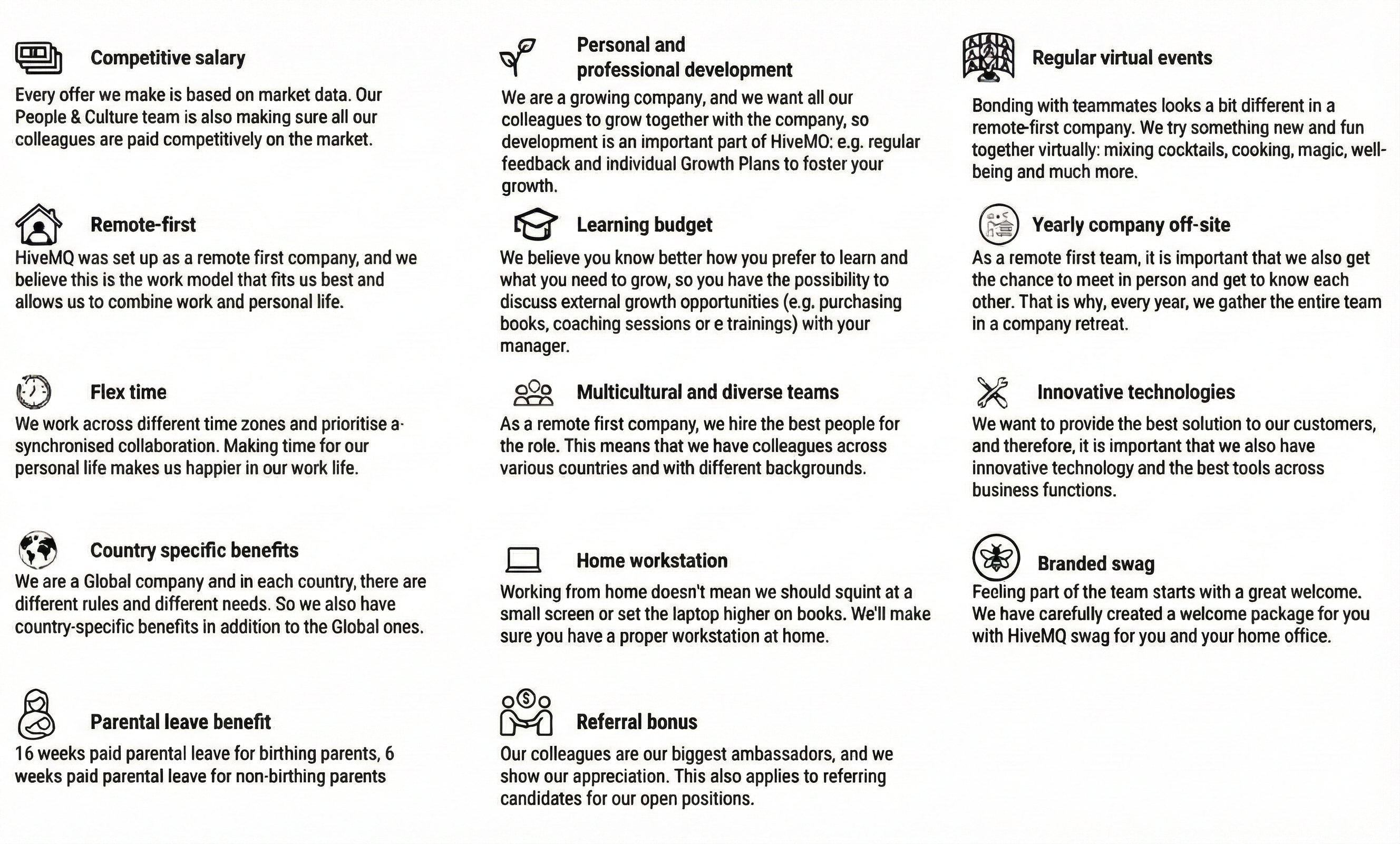 At HiveMQ, our culture is Effortless → Empowered → Relentless. We make the complex simple, act with confidence and ownership, and never stop pushing the boundaries of what’s possible. Join us to power the future of intelligent industry.