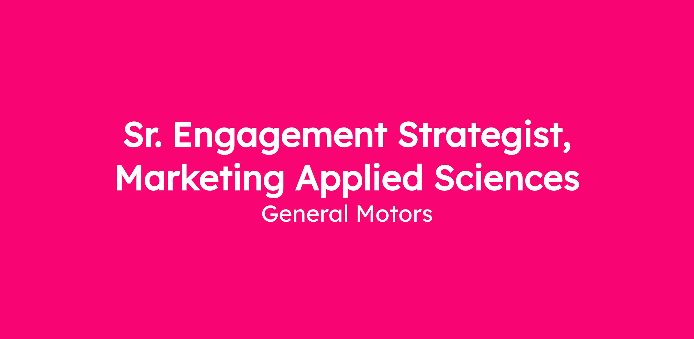The Marketing Applied Sciences (MAS) team is responsible for delivering data-driven solutions to help GM organizations achieve their business goals. The Sr. Engagement Strategist serves as a senior individual contributor and subject matter expert for marketing analytics, helping identify actionable insights across channels and drive ongoing performance optimization efforts. This role is ideal for someone who is hands-on with data, highly collaborative, and skilled at connecting metrics to marketing impact. The Sr. Engagement Strategist also plays a key role in the orchestration of cross-functional initiatives, coordinating with brand, product, and analytics partners to help measure and improve marketing effectiveness across media channels, audiences, websites, etc.