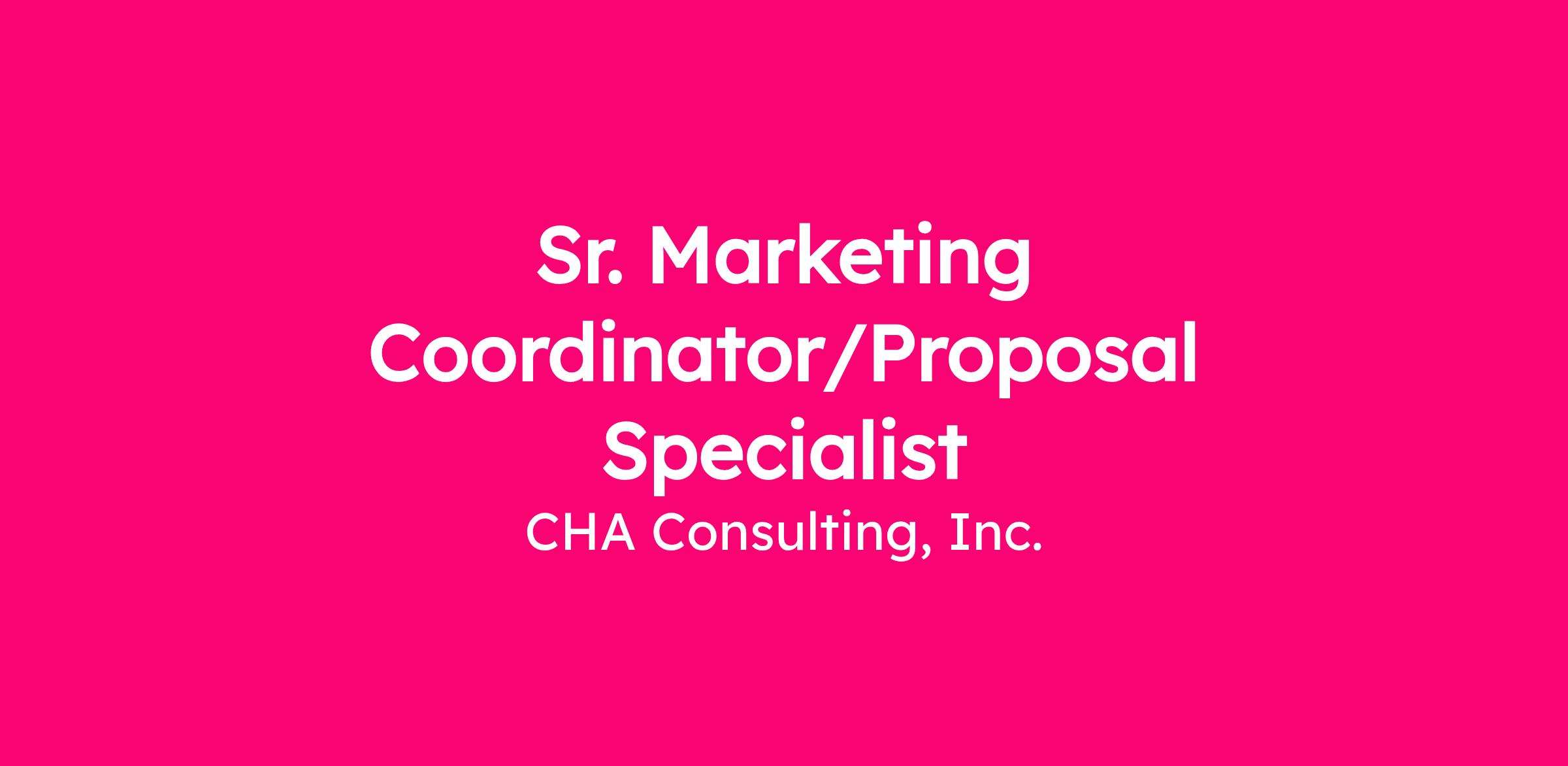 CHA Consulting, Inc. is seeking two Sr. Marketing Coordinator/Proposal Specialists to join our Marketing Team working remotely or at any of the following office locations: Albany, NY; Rochester, NY; Syracuse, NY; Parsippany, NJ; Fort Washington, PA; Hartford, CT; Indianapolis, IN; Silver Spring, MD; Reading, PA; or Nowell, MA. This is your opportunity to play a pivotal role in leading proposal efforts, supporting market strategies, and ensuring our marketing materials and client accounts are always a step ahead.