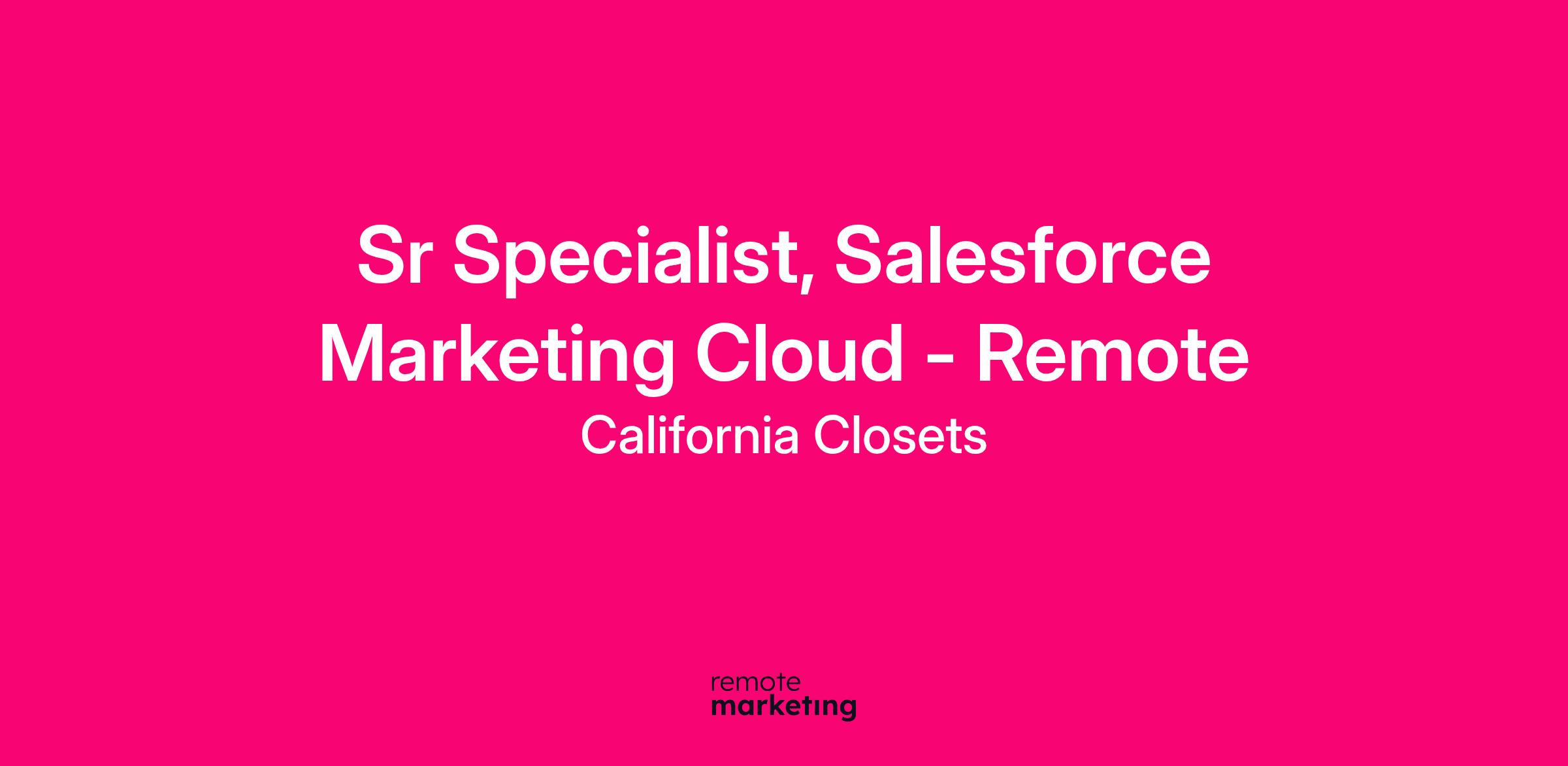We foster a values-based, collaborative environment and are seeking candidates who know how to drive growth while building deep partnerships. As a key driver of California Closets’ growth, this role works in partnership with cross-functional teams, and drives the results for a high-impact, high-visibility marketing channel, offering significant opportunities to make a meaningful impact on meeting our business objectives. The Senior Salesforce Marketing Cloud Specialist will report to the Senior Director, Relationship Marketing (CRM).